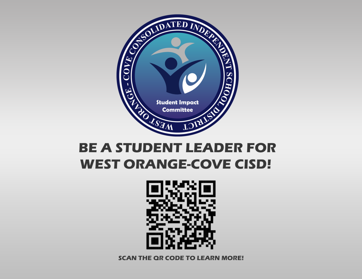 Students, we want your help shaping West Orange Cove CISD! Sign up for the Student Impact Committee! Limit 10 students —sign up today using the QR code!